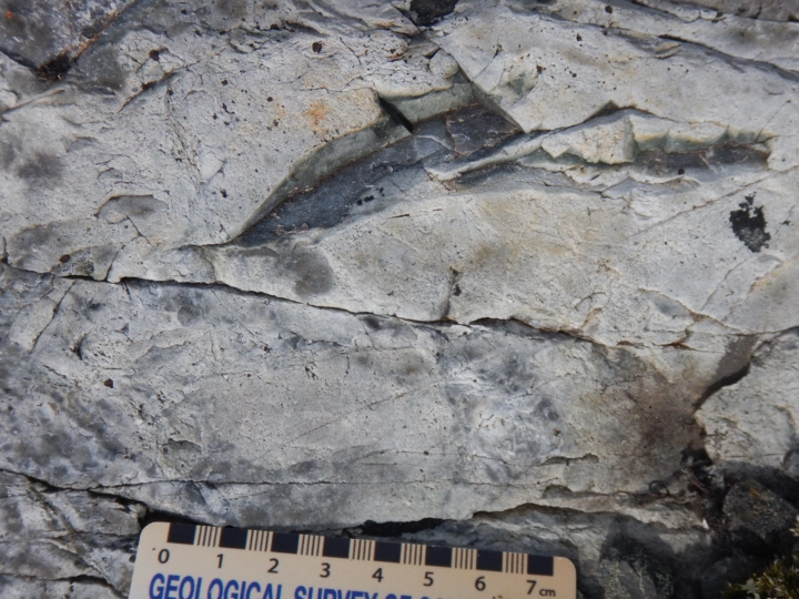 Felsic flow: bright white weathered, fine-grained surface. (ᐃᑯᒪ ᓄᓇᐅᑉ ᐃᑭᐊᖓᓄᑦ ᑯᕕᔪᖅ)