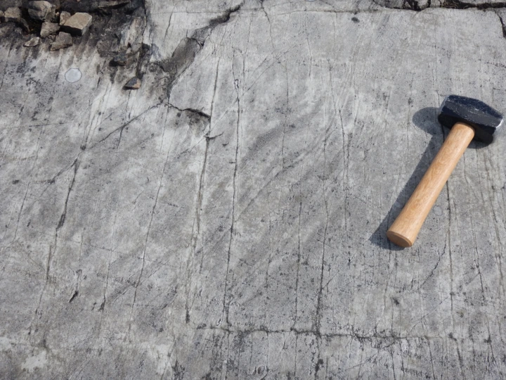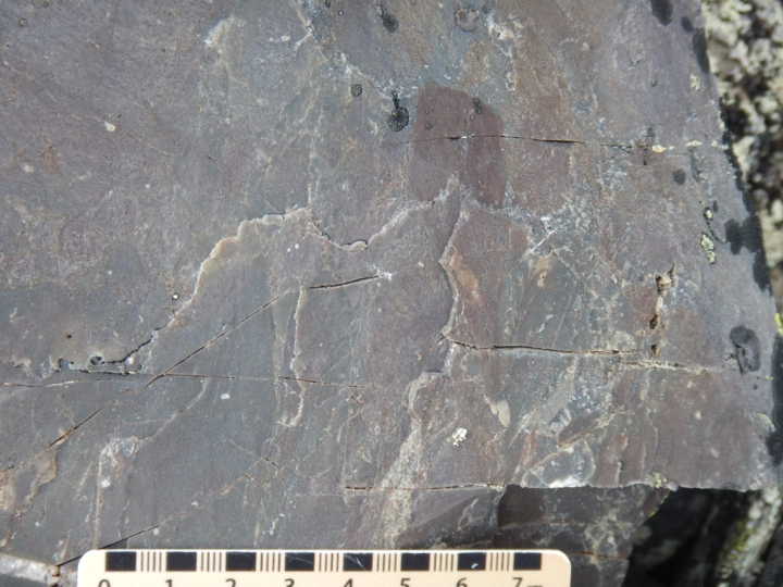 Felsic flow: fresh surface, grey or burgundy, flinty, hard: used for scrapers, knives and arrowheads. (ᐃᑯᒪ ᓄᓇᐅᑉ ᖄᖓᓄᑦ ᓯᐊᒻᒪᐅᑎᔪᖅ)