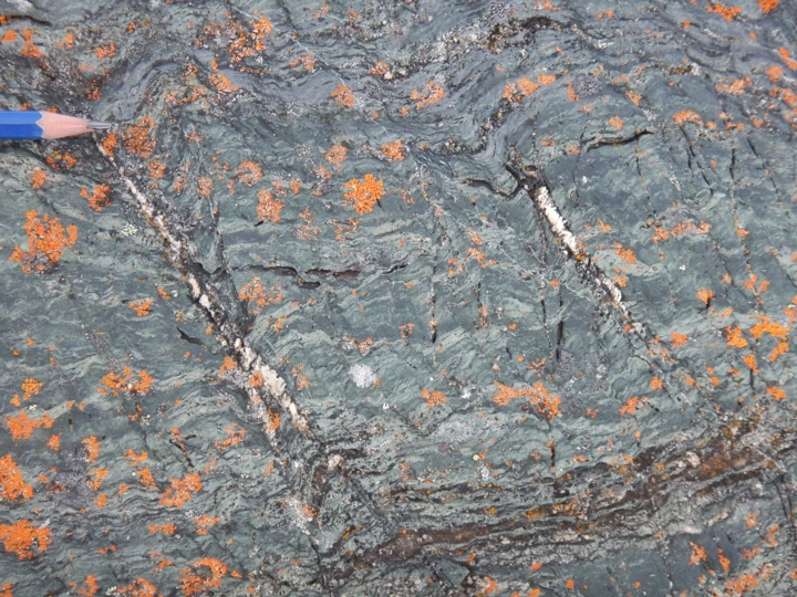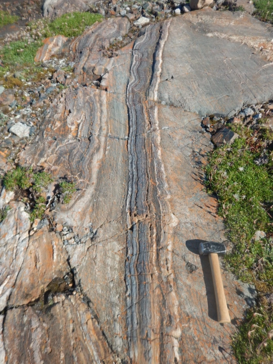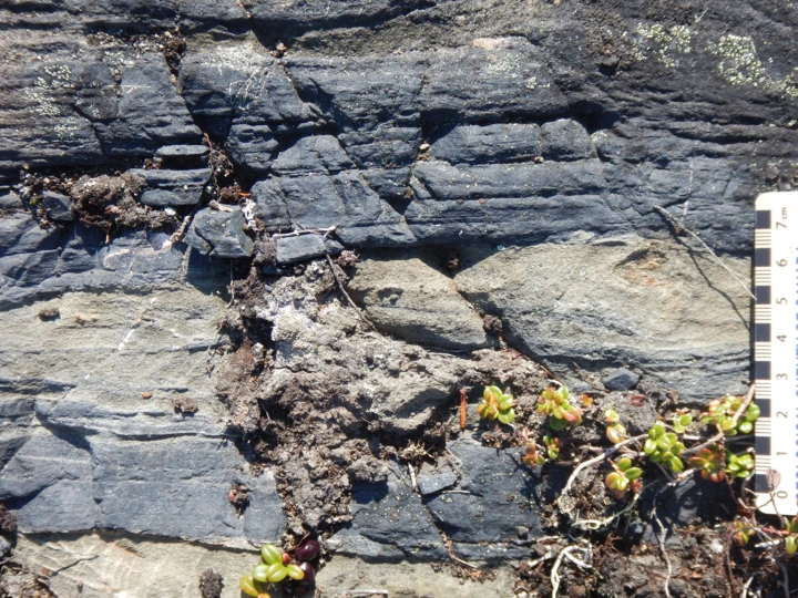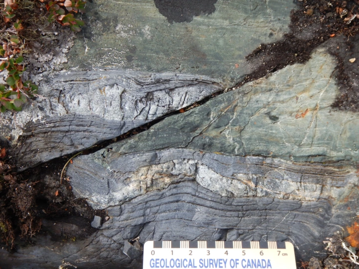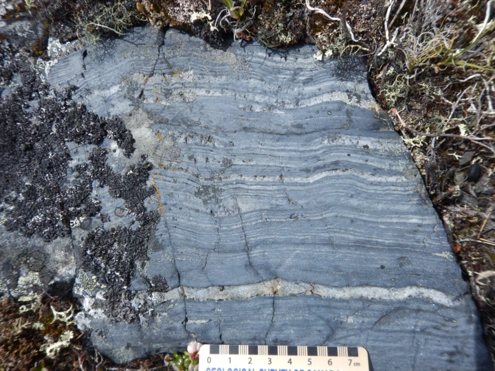 Magnetite iron formation: beds of magnetite interlayered with siltstone (clastic input).