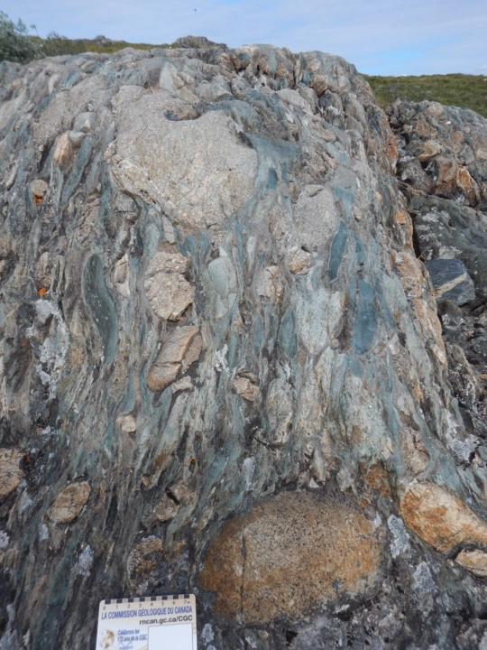 Conglomerate: rounded igneous intrusive clasts and elongate green to white weathering fine-grained volcanic clasts.