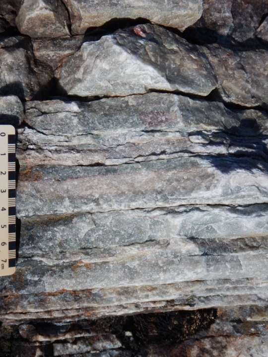 Quartzite (ᑕᖅᓴᓖᑦ ᐊᓕᒍᑦ): thinly bedded quartzite with trace oxidized iron (pink) and magnesium (green).